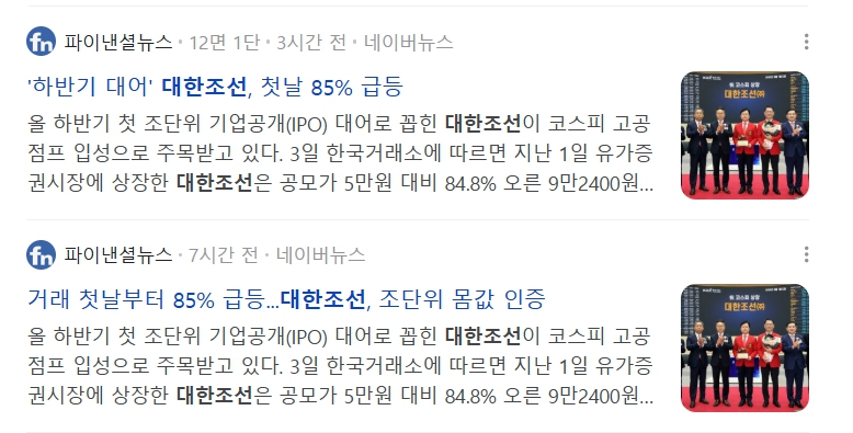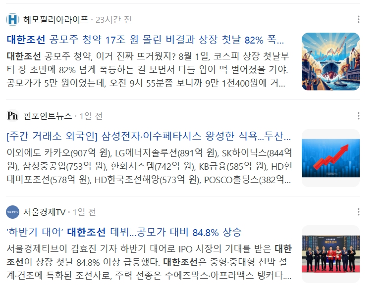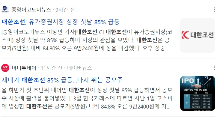 - 대한조선의 경우, 공모가 50,000원 → 상장 첫날 종가 92,400원으로 84.8% 수익률을 기록했죠.