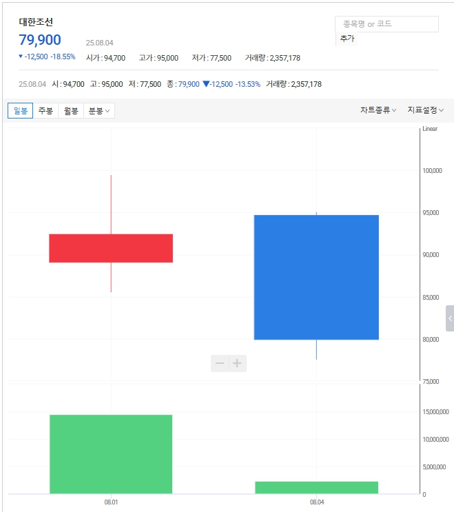 - 08.04 종가: 79,900원 (-18.55%, 전일 대비 -12,500원)
