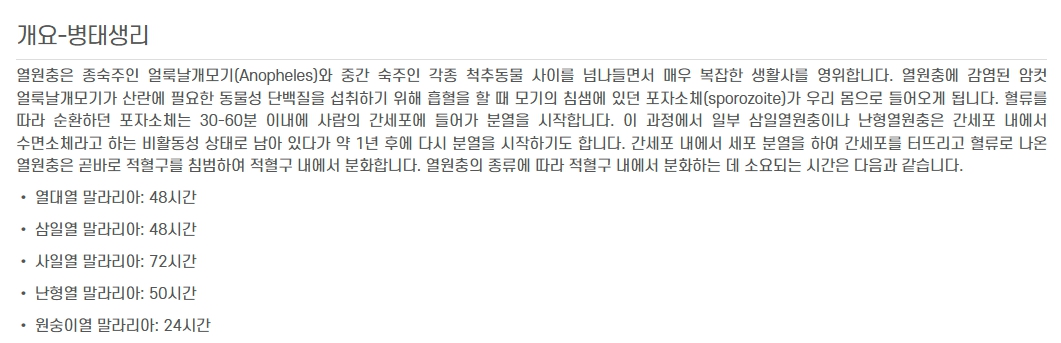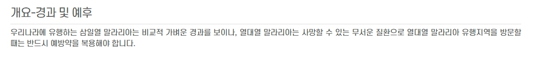 • 국내에서는 국립중앙의료원에서 말라리아 치료약을 무상 공급하므로, 병원 진료 시 여행력을 꼭 알리세요.