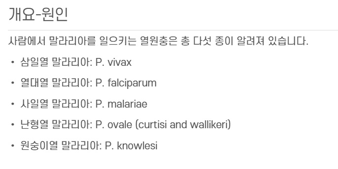 말라리아는 Plasmodium 기생충에 의해 발생하는 감염병으로, 감염된 모기(Anopheles)에 물리면서 전염됩니다.