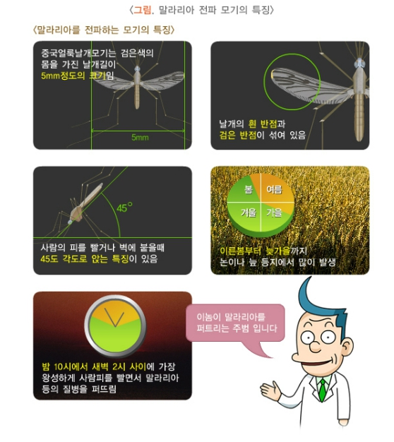 • 말라리아모기는 주로 4월~10월, 특히 해질 무렵부터 새벽 사이에 활동이 활발합니다.