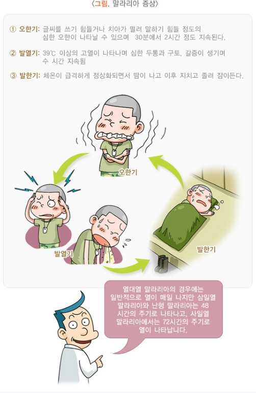 • 오한 → 고열 → 땀 흘림의 주기적 패턴