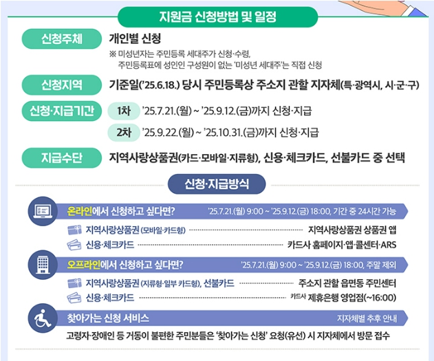 위에 해당되면 주민센터에서 직접 방문 신청하여 지역사랑상품권, 선불카드, 또는 본인 명의 체크카드로 지급받을 수 있습니다.