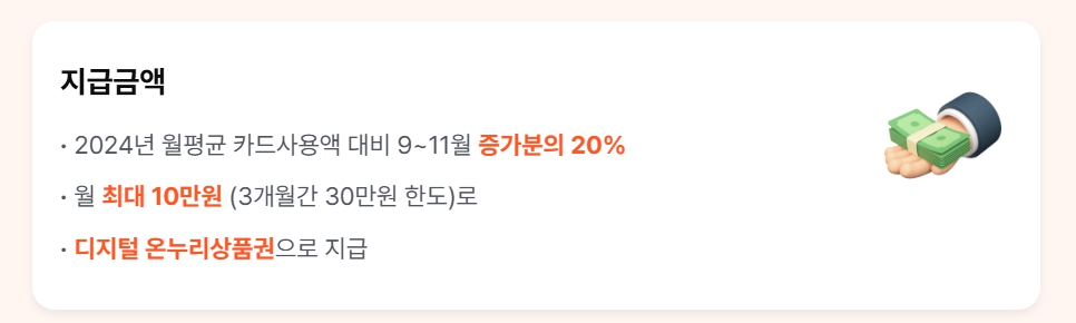 간단히 말해, 2024년 카드 사용 실적보다 2025년 9~11월 동안 소비가 늘면 그 증가분의 20%를 디지털 온누리상품권으로 환급해주는 방식입니다.