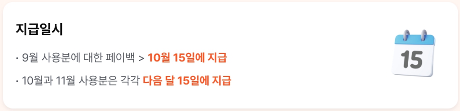 - 9월 소비분 → 10월 15일부터 순차 지급 (단, 10월 9일까지 신청해야 포함)