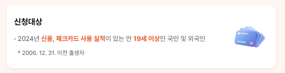- 대상: 2024년 카드 실적이 있는 만 19세 이상 국민 및 외국인 (2006년 12월 31일 이전 출생자)