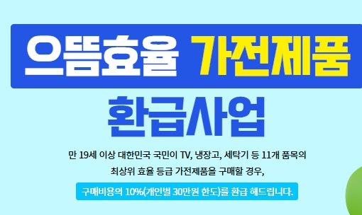 - 지원 내용: 고효율 가전 구매 시 구매금액의 10% 현금 환급 (1인당 최대 30만 원)
