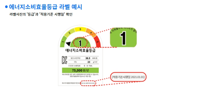 - 제품에 에너지효율등급 라벨이 붙어 있고, ‘등급’ 및 ‘적용기준 시행일’이 명시돼 있어야 합니다.