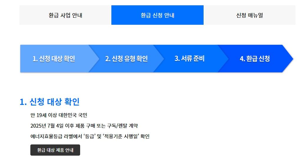 2025년 시행 중인 이번 사업은 에너지 소비효율 1등급 제품(일부 품목 2등급 포함)을 구매한 국민 누구나 신청할 수 있으며,