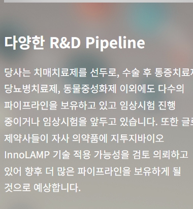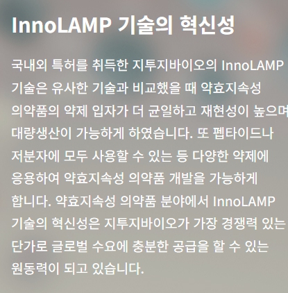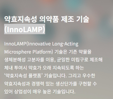 - 플랫폼 기술: 이노램프(InnoLAMP) – 약효를 오래 지속시키는 주사제 플랫폼