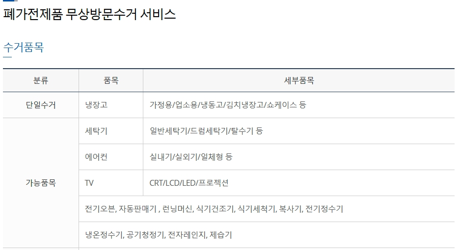 | 무상수거 대상 (별도 신청) | 냉장고, 세탁기, 에어컨, 전자레인지, TV 등 |
