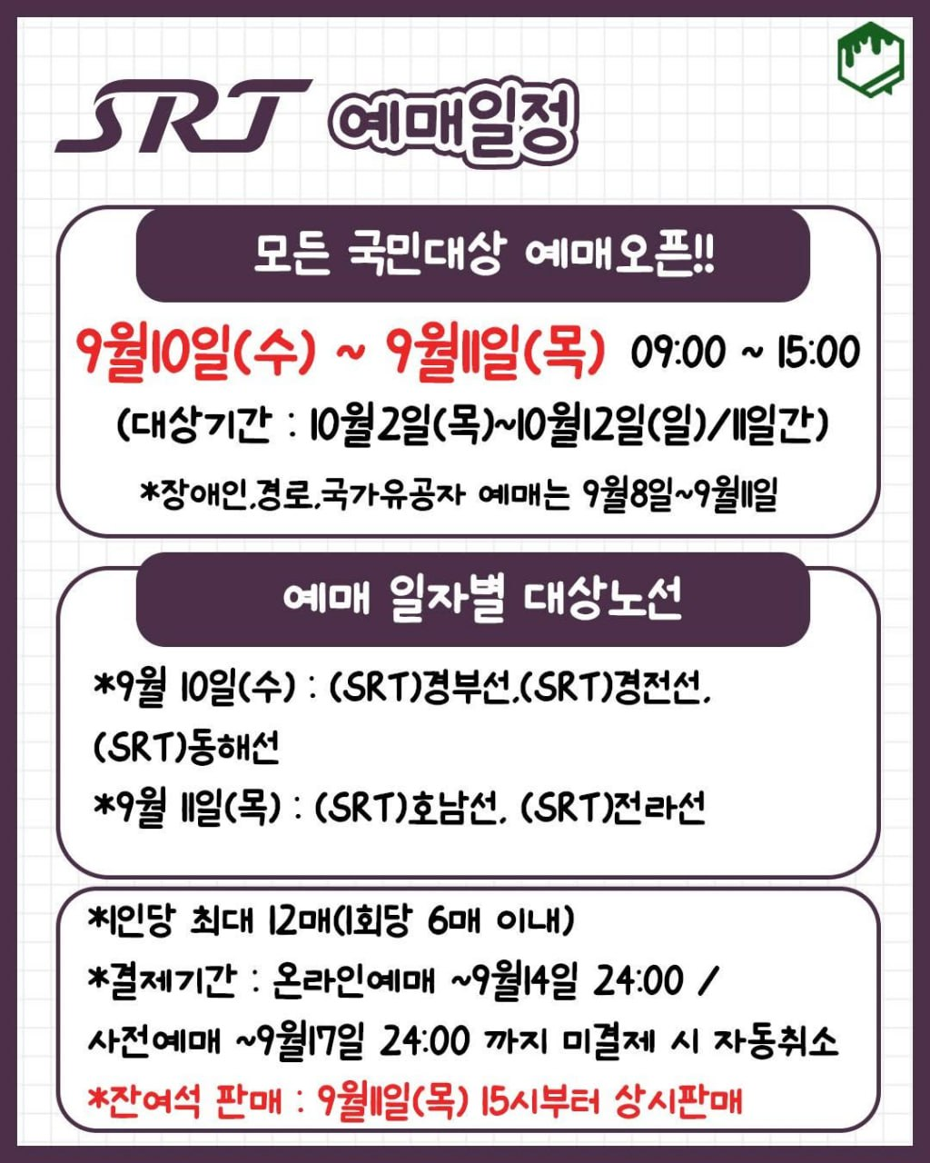 ✅ 잔여석 판매 확인 (SRT: 9/11 15시부터)