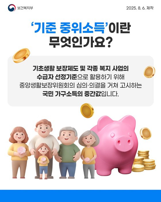 정부는 이 기준 중위소득을 바탕으로 기초생활보장제도와 각종 복지사업의 수급자 선정 기준을 결정합니다.