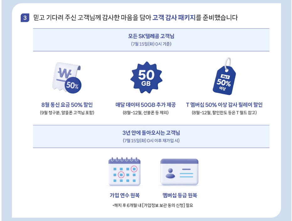 | 8월 통신 요금 50% 할인 | 9월 청구분에 반영, 알뜰폰 포함 대부분 고객 대상 |